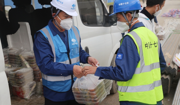 在一遍遍的沟通对接中,贺中国不厌其烦,以认真负责的态度和主动担当的作为,保障了每位员工的就餐大事。每次发放餐食时,贺中国同各班组负责人将一提提热气腾腾的盒饭送到工人手中。看到工人们满意的笑容,他的脸上也是露出了由衷的笑容。在当前防疫特殊时期,正是像贺中国这样的一位位后勤工作者,以辛勤的付出保障着工人们的健康,为项目的正常运转提供着可靠有力的支撑。