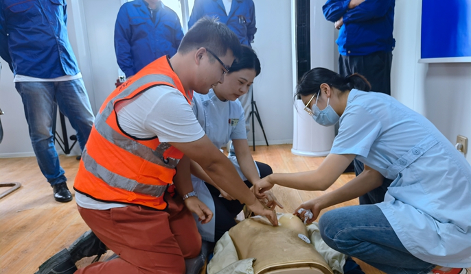 体检过程中,现场医务人员对一线工人进行了血压、心肺等项目的检测,并结合每一个工人的病史,对工人们提出的健康问题进行了耐心解答,嘱咐大家要养成良好的生活习惯。项目部管理人员详细记录了参检人员的姓名、年龄、工种、健康状况等基本信息,建立了健康档案,为现场安全管理积累了真实有效的健康数据资料。为增加施工人员的急救意识,加强意外伤害的救护能力,项目部还邀请专业医护人员举办了一场内容丰富的应急救护技能培训。本次培训主要针对心肺复苏详细讲解,并结合各种意外情况的案例现场进行心肺复苏模拟,演示正确的处置方法,确保施工人员在遇到紧急情况时能够正确应对、科学处置,避免了因操作不当而导致的二次伤害。