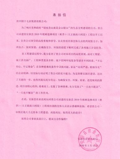 1月15日,河北安新县农业农村局向中国十七冶集团发来表扬信,对交通工程技术分公司承建的安新县2019年植树造林项目顺利完成各项施工计划予以赞扬,对公司领导的高度重视及项目部全体人员的辛勤付出给予充分肯定和认可。