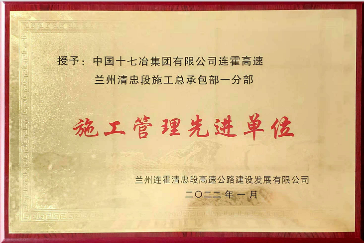 1月11日,中国十七冶集团交通工程技术分公司连霍高速兰州清忠段施工总承包一分部项目经理部被兰州连霍清忠段高速公路建设发展有限公司授予“施工管理先进单位”荣誉称号,表彰和赞扬项目部高效严谨的工作作风以及一丝不苟扎实推进各项施工管理的工作精神。