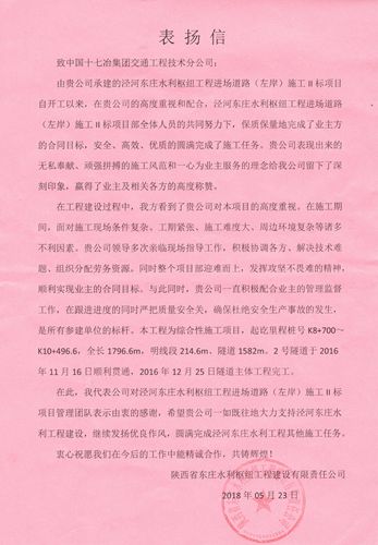 5月23日,陕西省东庄水利枢纽工程建设有限责任公司向公司致信,表扬陕西泾河东庄水利枢纽进场道路工程项目部保质保量完成业主方的合同目标,安全、高效、优质的圆满完成施工任务。