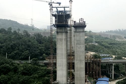 西山特大桥主跨长度为96.5+180+96.5m,预应力混凝土连续刚构,箱梁梁段采用复合型式牵索挂篮,该挂篮由承重系统、提升锚固系统及止推系统、定位调整系统、行走系统、模板系统等几部分构成,施工挂篮总重最高约为216吨。挂篮在0#块底下拼装完成后,采用直径32毫米精轧螺纹钢与千斤顶配合同步提升,提升就位后,进行主梁标准节段施工。项目部统筹安排,保证人员、设备、材料到位,全力以赴抓好挂篮施工前的各项准备工作。同时加强对施工人员的安全技术培训交底,并针对高墩风荷载实施监测制定应对措施,同时采用项目部自主研发高性能机制砂泵送技术,确保混凝土顺利浇筑完毕。
