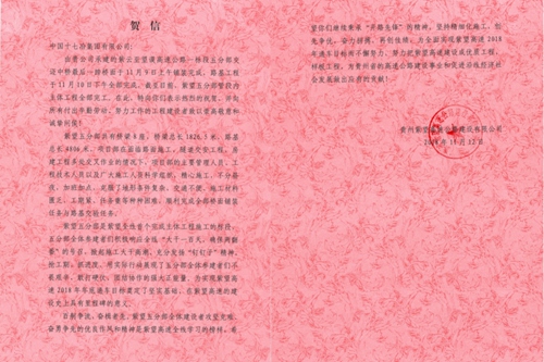 11月12日,贵州紫望高速公路建设有限责任公司向中国十七冶集团致贺信,对公司贵州紫云至望谟高速公路五分部项目部顺利完成全部主体工程和所取得的成绩表示热烈祝贺。